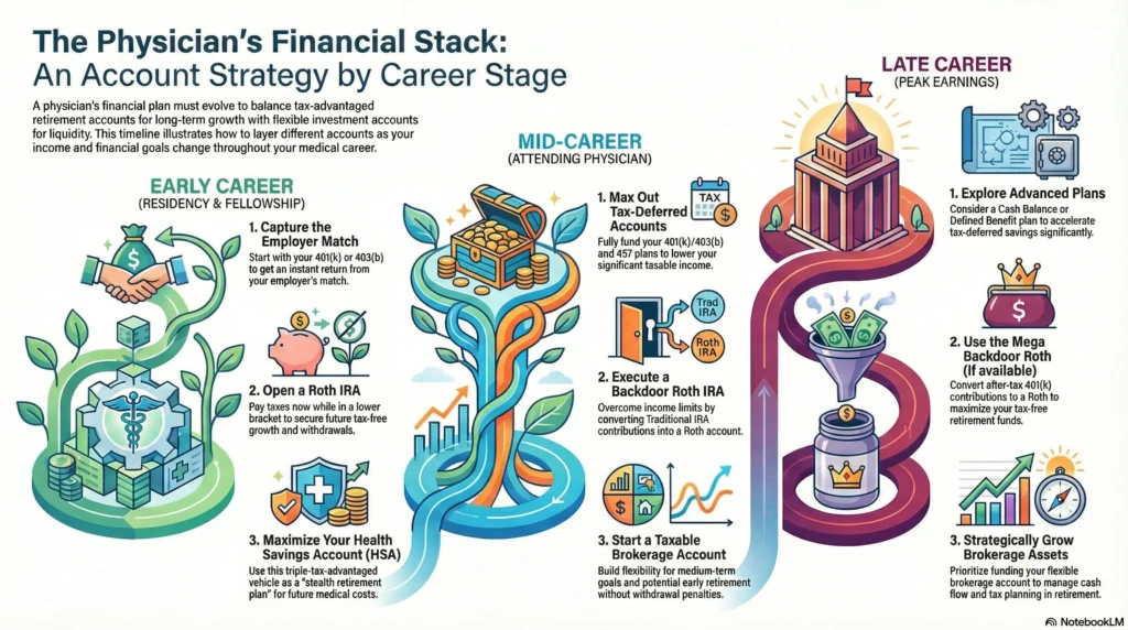 This is why many physicians use both—layering Traditional accounts early and Roth accounts later through backdoor Roth IRA strategies.